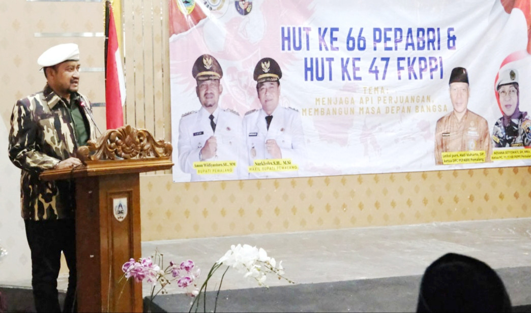 TV PEMALANGCOM – Bupati Pemalang, Anom Widiyantoro, menghadiri peringatan Hari Jadi Persatuan Purnawirawan dan Warakawuri TNI-Polri (PEPABRI) ke-66 dan Forum Komunikasi Putra Putri Purnawirawan TNI-Polri (FKPPI) ke-46 di Gedung Sasana Bhakti Praja, Minggu (14/9/2025).