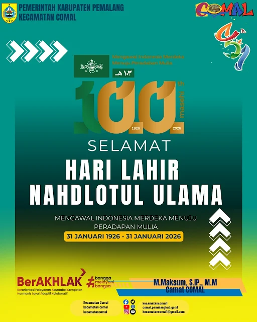 TVPEMALANG.COM – Camat Comal, Muchammad Maksum, S.I.P., M.M., menyampaikan ucapan selamat dan apresiasi atas peringatan Satu Abad Nahdlatul Ulama (NU) yang menjadi momentum bersejarah bagi umat Islam di Indonesia.