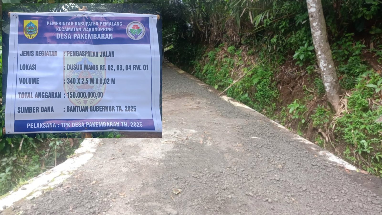 TVPEMALANG.COM – Pemerintah Desa Pakembaran, Kecamatan Warungpring, terus berupaya meningkatkan kualitas infrastruktur di wilayahnya. Melalui alokasi Dana Bantuan Gubernur (Bangub) Tahun Anggaran 2025 sebesar Rp150 juta, desa tersebut merealisasikan pembangunan jalan aspal di Dusun Manis RT 001, 002, dan 003 RW 001 dengan panjang mencapai 340 meter dan lebar 2,5 meter.