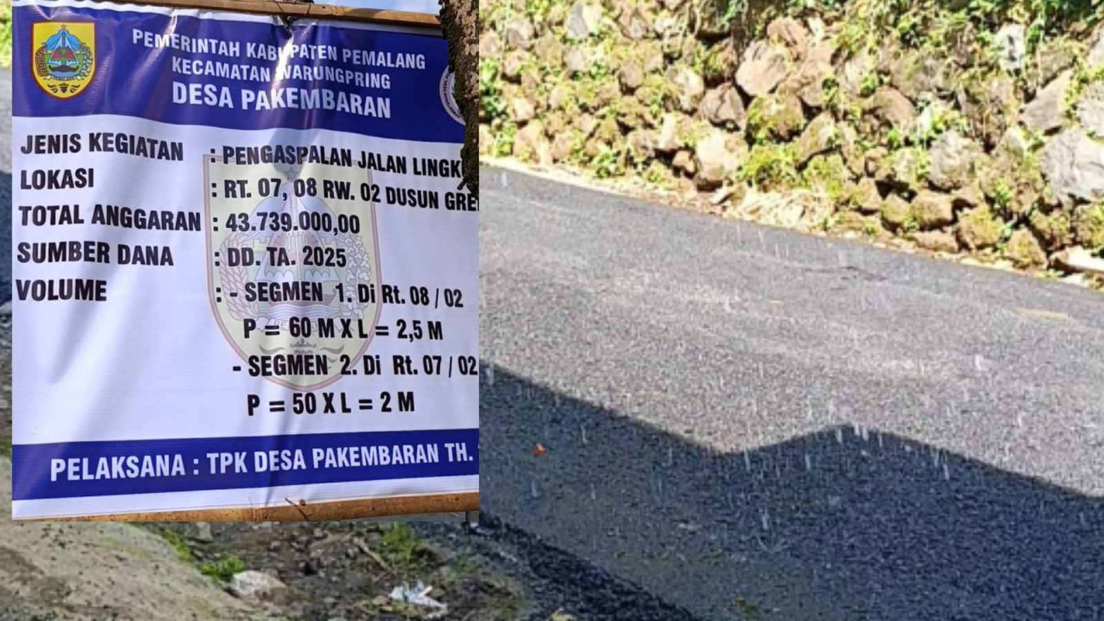 Proyek pengaspalan tersebut meliputi dua segmen, yakni segmen 1 di RT 08/RW 02 dengan panjang 60 meter dan lebar 2,5 meter, serta segmen 2 di RT 07/RW 02 dengan panjang 50 meter dan lebar 2 meter. Total anggaran yang dialokasikan untuk kegiatan ini mencapai Rp43.739.000,00, bersumber dari Dana Desa Tahun Anggaran 2025.